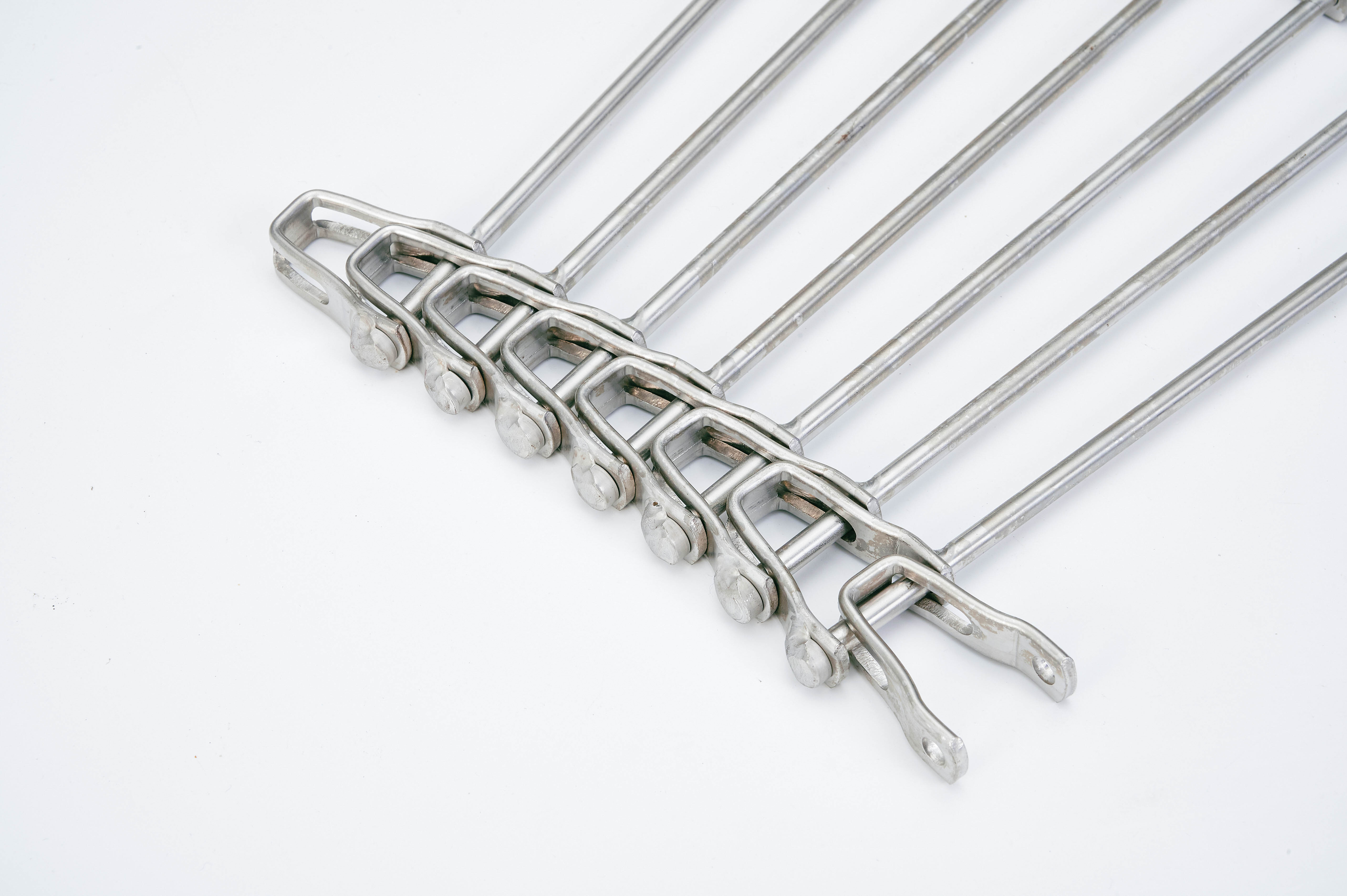 • 鏈條式的不銹鋼輸送網(wǎng)帶是通過(guò)在螺線中穿入圓棒來(lái)完成鏈條的安裝。